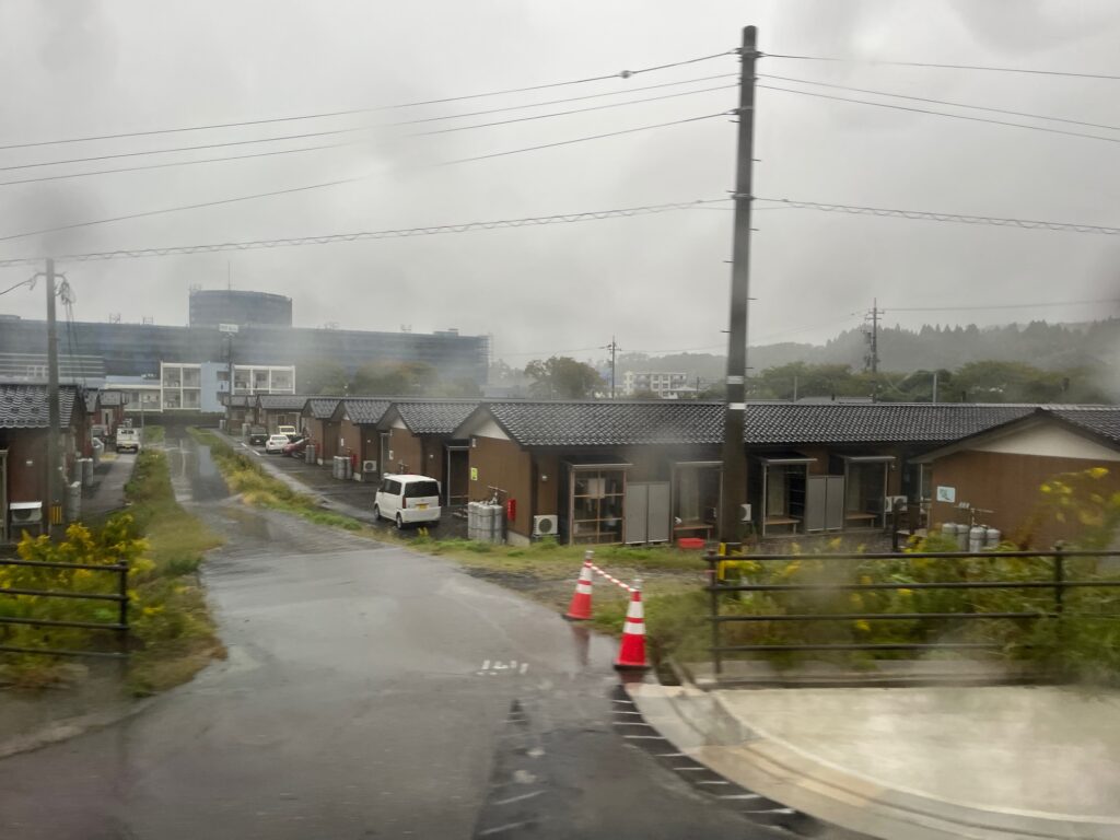 バスガイドさんも車中で話をしていましたが、やはり被災以前はとても活気のある朝市でそれが当たり前だったのに・・・と心痛な状況でした。3枚目の写真は酒蔵で今は酒樽が2階を支えている状態で残っている形でした。ちょうど店舗として営業もしていたのですが、その酒屋さんは大正元年の創業で本当に歴史ある店舗・企業が多く存在していた地域が被災にあってしまったという形でした。歴史があるだけに建物自体も昔の作りで木造・瓦屋根の建物ばかり。非常に風情溢れる町並みですが、一方で耐震性に優れているか?というと何とも言えない状況があり、被害が大きくなってしまった原因のひとつかなと想像しました。また街中には仮設住宅が幾つもあり、現在暮らしている人たちも数年後に退去・継続の判断が迫られるような話を伺い依然として被災してからの復興が非常に大変なんだと感じました。