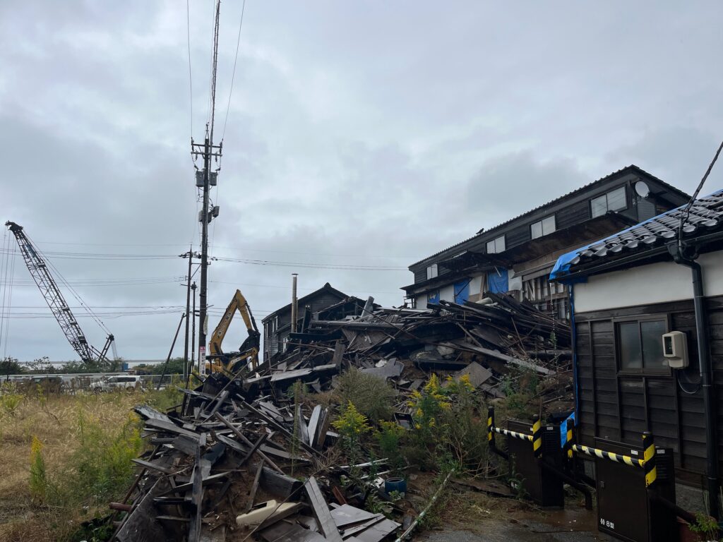 現地の方々の前向きな取り組みに触れ、参加者一同、地域とのつながりや支援の大切さを改めて感じました。その一方でTVやSNS等で見る姿よりもはるかに上回る被害の大きさに愕然としました。今でこそ少し時間がたったこともあり道路など整備が進んではいますが、それでもなお全くの手つかずの状態が街中にあふれていました。よくTVでも報道されている輪島朝市の跡地などは仮設住宅が至る所にあり、本来の住居は震災直後の状態のままというご自宅が複数ありました。