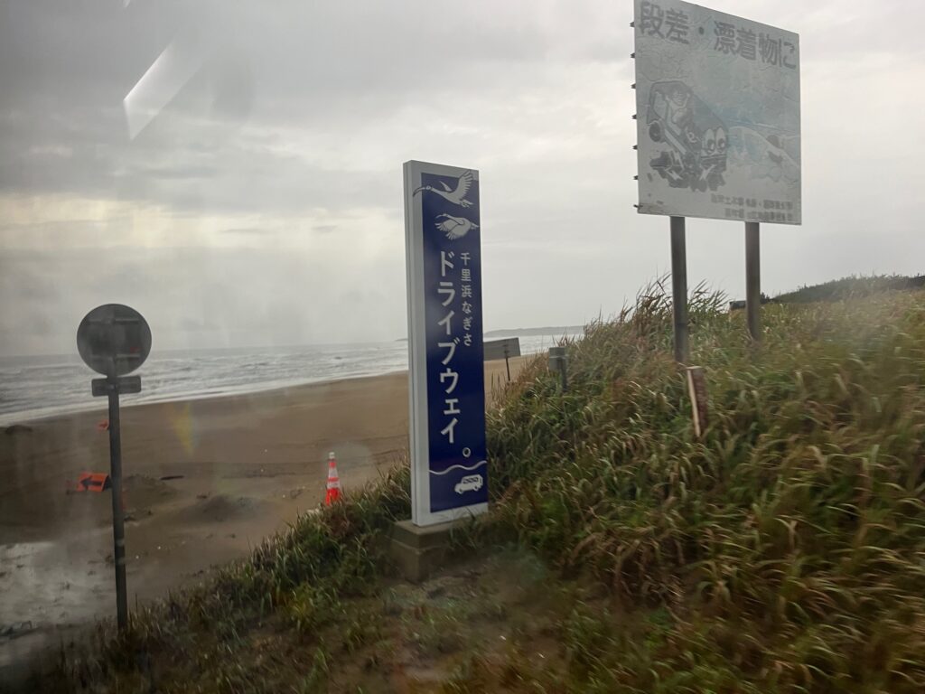 それまではあいにくの空模様で雨も降っていたのですが、ちょうど私たちのバスが走り始めるタイミングで雨も収まり日本海を眺めながら、心に残る時間となりました。バスガイドさんによると、天候がいいからと言って砂浜の状態や波の大きさによっては通行禁止のタイミグもあるみたいなので、本当にラッキーでした(^^♪